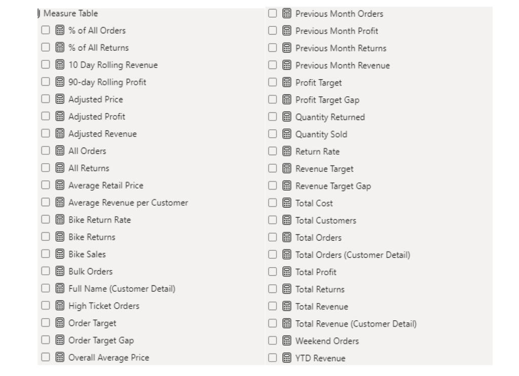 The list of calculated measures is available below and includes key information on revenue, profit, orders, returns, and more.
