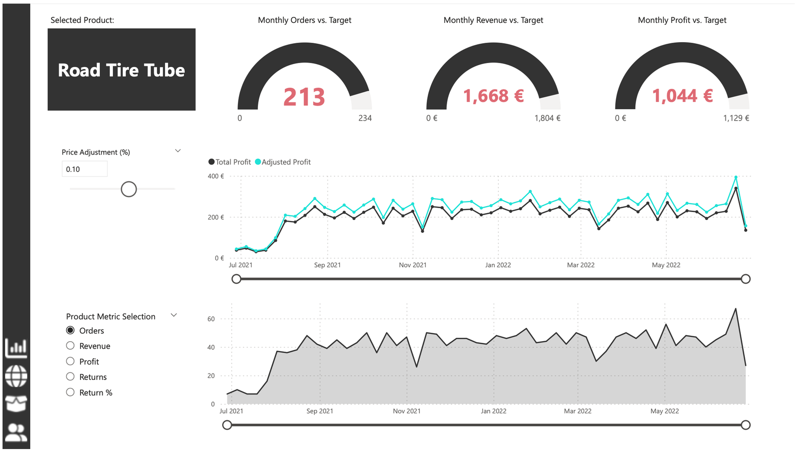 Product Detail: The third report page focuses on detailed product-level analysis. It displayed detailed product information for the selected top 10 products from the Executive Dashboard, using the drill-through feature. It also included gauge charts presenting actual performance vs target performance of monthly orders, revenue, and profit, and included an interactive line chart to visualize potential profit adjustments when manipulating the price of the product, aiding in strategic decision-making regarding pricing strategies. This report page also included a line chart including key weekly product information on total orders, revenue, profit, returns, and return rate.